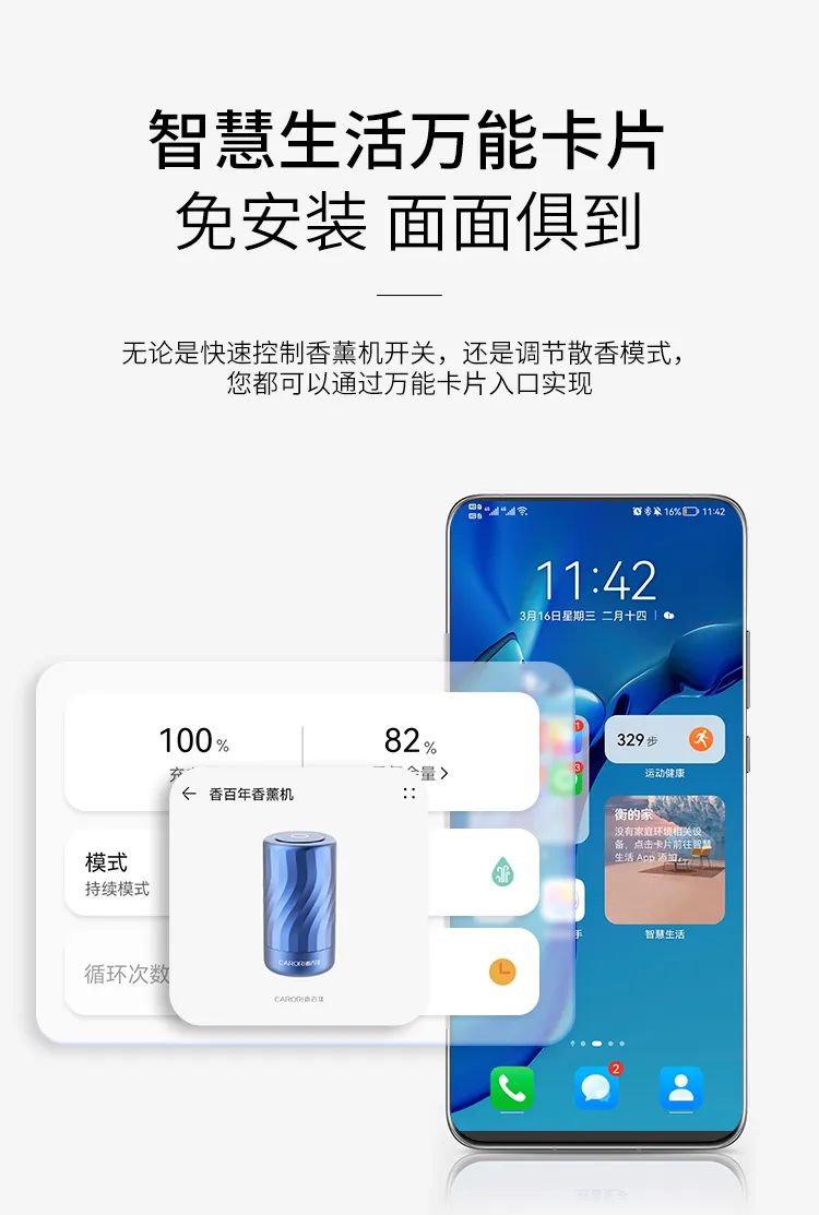 用手機(jī)連接香百年智能香薰機(jī)后,在HarmonyOS中上滑App圖標(biāo)即可生成萬(wàn)能卡片,放置在桌面的任何位置,直接顯示信息。比如當(dāng)前模式、剩余電量、循環(huán)次數(shù)、持續(xù)時(shí)長(zhǎng)等。